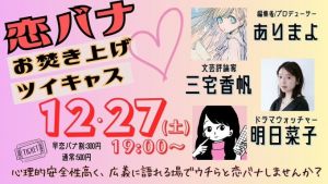 まずは年末恒例、明日菜子ちゃんと三宅香帆ちゃんと、今年の恋バナを皆で供養する「恋バナお焚き上げツイキャス」を12/27(土)19:00~やります! 参加者の皆さま(と、われわれ)のプライバシー保護のため有料となっています。